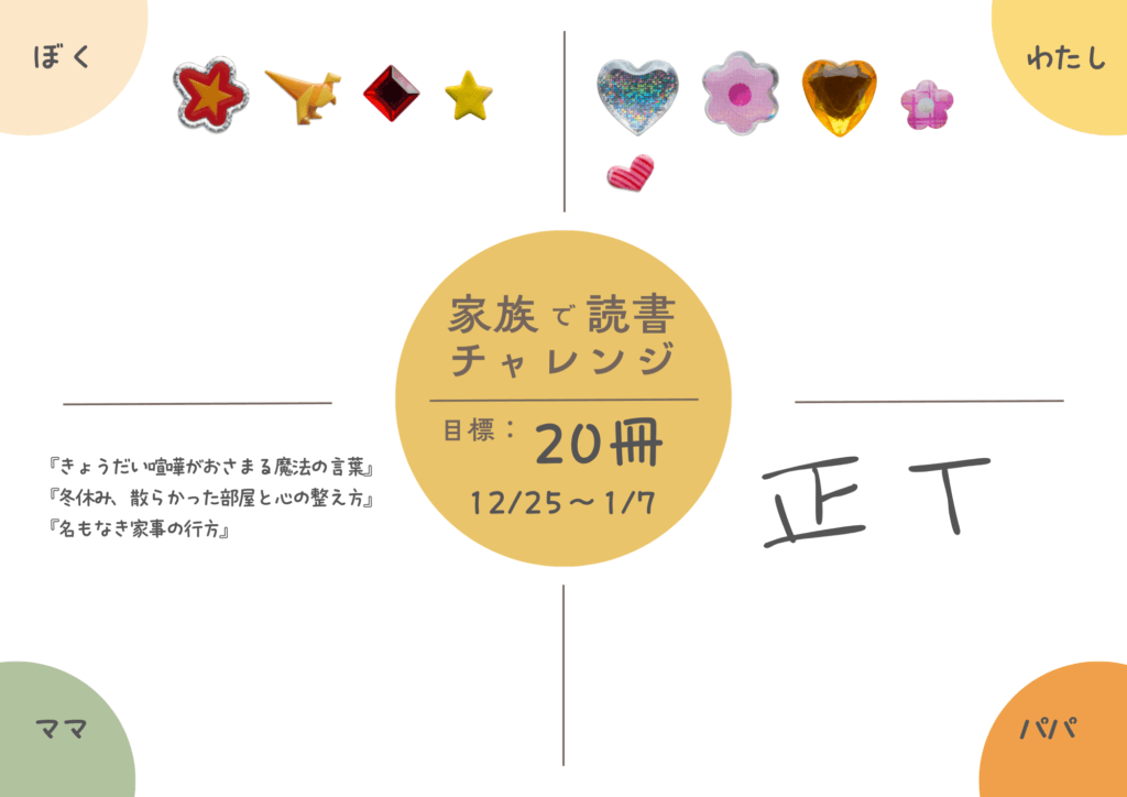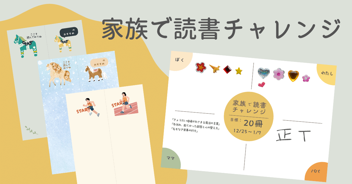 家族で読書チャレンジ 2025 12/23 無料ダウンロード 2025年12月23日 2025年12月23日 1人でやるよりも、家族でやればもっと楽しい! ↑使用例 「家族で読書チャレンジ」はA4で印刷してください 家族で読書チャレンジシート (1)ダウンロード しおりはハガキサイズで両面印刷 冬休み2025しおり①ダウンロード 冬休み2025しおり②ダウンロード 冬休み2025しおり③ダウンロード 著作権は放棄していません。個人で楽しむ範囲でご利用ください☺ 無料ダウンロード この記事が気に入ったら フォローしてね! Follow Me よかったらシェアしてね! URLをコピーしました! URLをコピーしました!